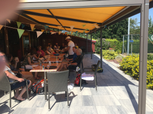 Vanaf 11.00 uur gingen we starten, al snel bleek dat de temperatuur aardig opliep, de tennissers kwamen verhit van de baan… ‘genoeg drinken en tussendoor in de schaduw’ was het advies van de wedstrijdleiding, tevens werden aan het einde van de middag een aantal partijen wat ingekort.